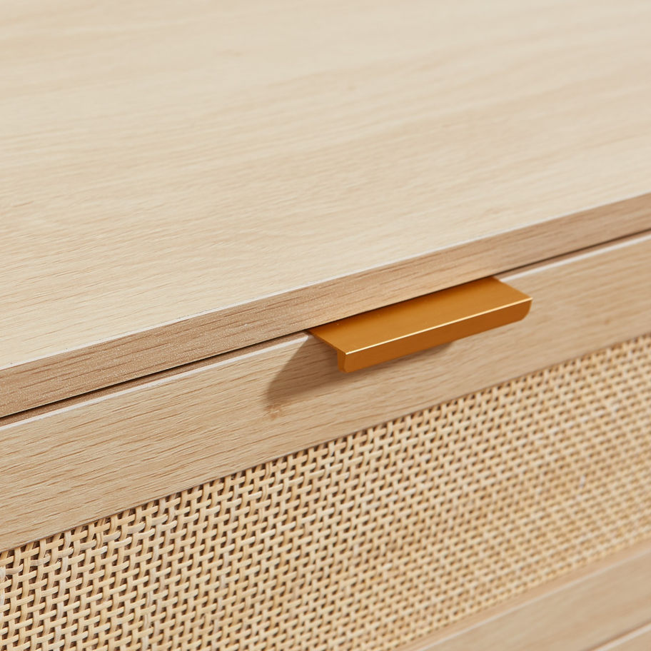Mdf üzeri ahşap kaplamalı gövdesi dayanıklı ve sağlamdır, böylece çamaşır, havlu, yatak örtüleri ve diğer ev tekstilleri gibi ağırlıklı öğeleri bile güvenle depolayabilirsiniz. Çekmece kapaklarındaki hasır detaylar, şifonyerinizin dekorasyonunuzda sofistike ve zarif bir ayrıntı olmasını sağlar.