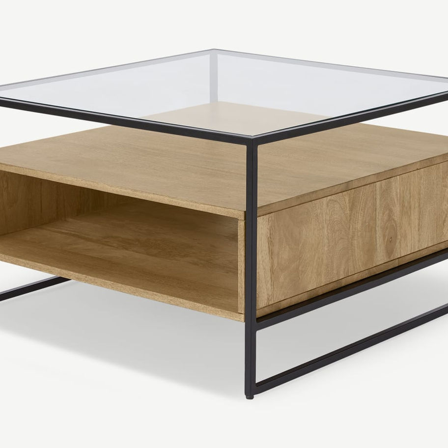 80x80 cm ölçülerindeki kare formu ve 47 cm yüksekliğiyle Kilby Sehpa, sadece şıklığı değil, fonksiyonelliği de merkezine alan bir tasarım sunar. Temperli cam üst yüzeyi, doğal ahşap dokulu orta raf ve çekmeceli alt bölmeyle birleşerek çok katmanlı bir kullanım sağlar.